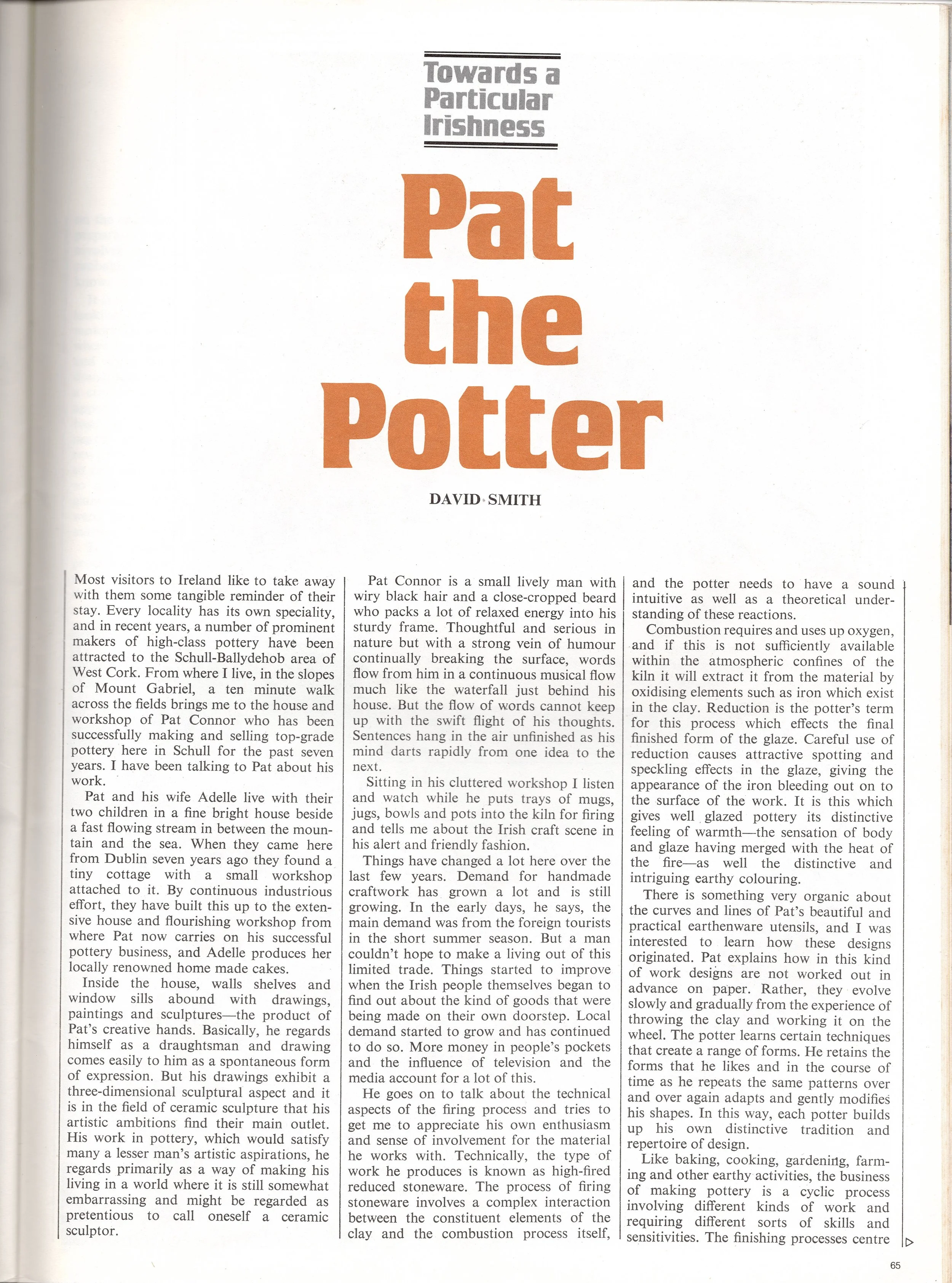 Pat and his wife Adèle live with their two children in a fine bright house beside a fast flowing stream in between the mountain and the sea. When they came here from Dublin seven years ago they found a tiny cottage a small workshop attached to it. By continuous industrious effort, they have built this up to the extensive house and flourishing workshop from where Pat now carries pottery business, and Adèle produces her locally renowned home made cakes.