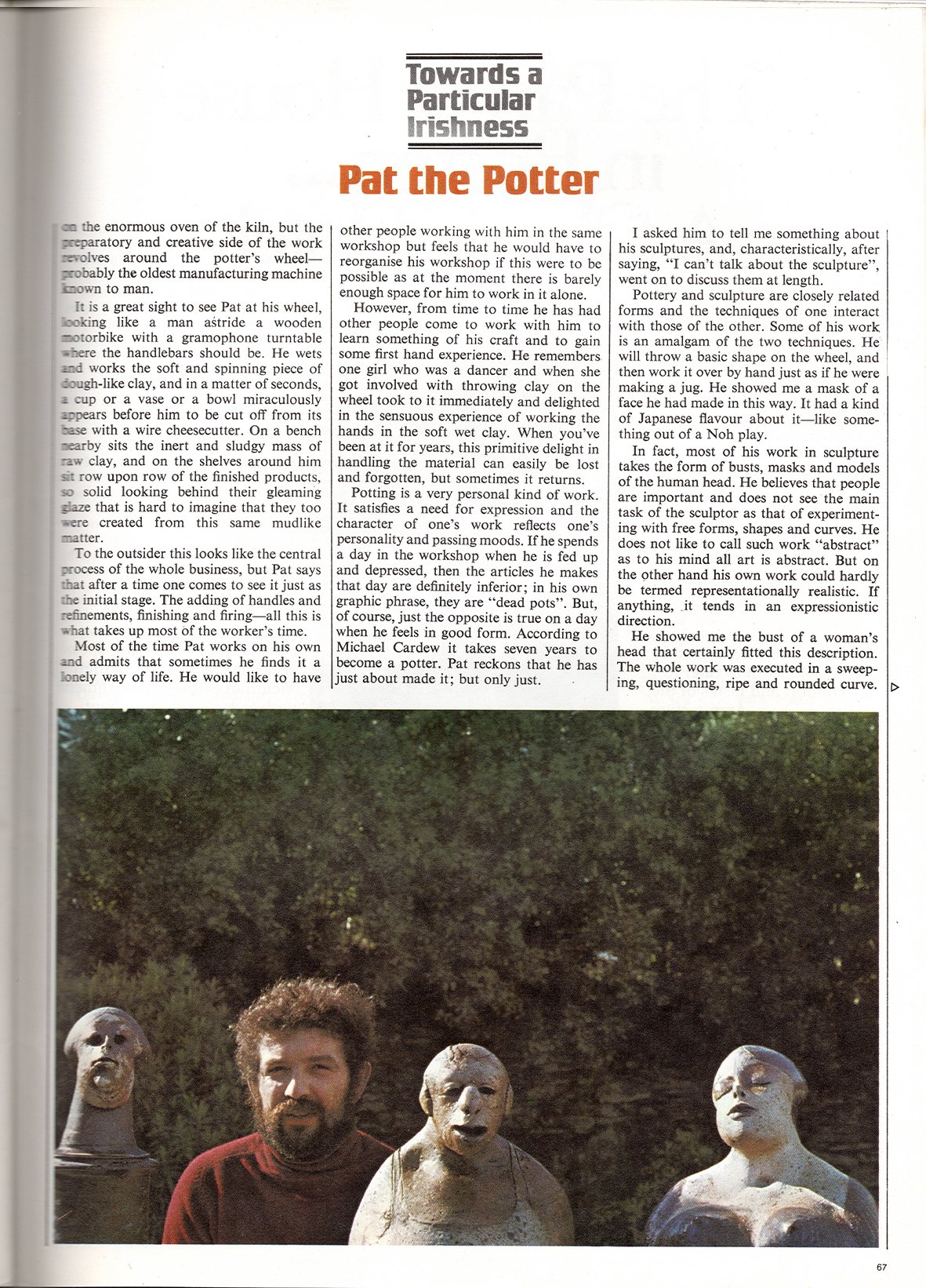 Inside the house, walls and shelves and window sills abound with drawings, paintings and sculptures-the product of Pat's creative hands. Basically, he regards himself as a draughtsman and drawing comes easily to him as a spontaneous form of expression. But his drawings exhibit a three-dimensional sculptural aspect and it is in the field of ceramic sculpture that his artistic ambitions find their main outlet. His work in pottery, which would satisfy many a lesser man's artistic aspirations, he regards primarily as a way of making his living in a world where it is still somewhat embarrassing and might be regarded as to call oneself a ceramic sculptor.